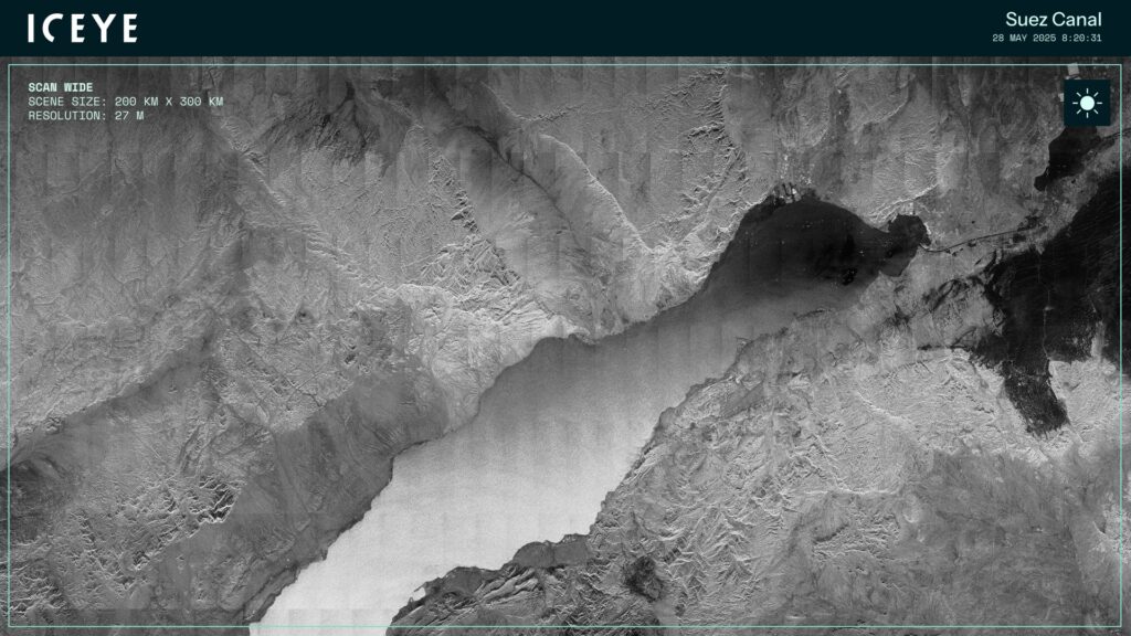 A 200×300 km Scan Wide SAR image of the Suez Canal collected on 28 May 2025. Scan Wide is particularly useful for maritime ISR applications. [ICEYE]
